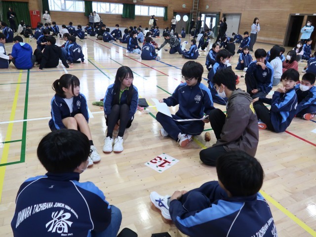 生徒会入会式を行いました。レクリエーションでは、1~3年生が入り混じるチームで生徒会企画のゲームを楽しみました。新1年生が早く中学校に打ち解けられるといいなと思います。