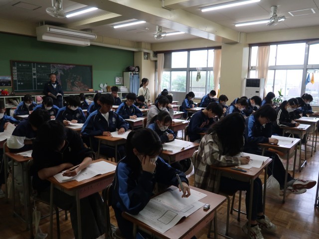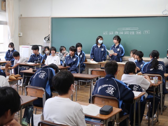 3年生が調査に打ち込んでいるときに1年生の教室をのぞいてみると、生徒が前に立って生徒総会の議案書検討を行っていました。生徒会活動への理解は深まったかな~1年生。