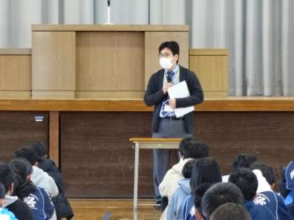 最後は、生徒指導担当の三城先生より、冬休みの過ごし方についてのお話がありました。自転車の乗り方や、外出する際の注意がありました。