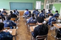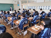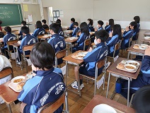 令和4年度まで本校は学級を二分割し、教室と学習室で距離を十分に保ちながら同じ方向を向いて黙食をしてきました。令和5年度は全員教室で同じ方向を向いて給食をいただくことから始めました。生徒は自らの判断で黙食をしています。