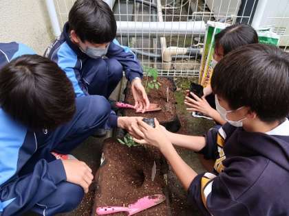 今日は苗を植えました。おいしいトマトが収穫できるように丁寧に作業をしました。