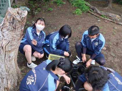 4月に種を撒いたひまわりを、体育館のわきに移植しました。