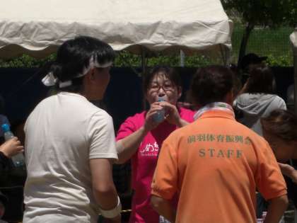 写真は、パンくい競争、下中たまねぎ運び、ラムネ飲み競争の様子です。面白い種目がありますね。たまねぎがそのまま商品になるとのことでした。うらやましい。ラムネ飲みをしている人は、もしや○○○会長では。