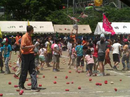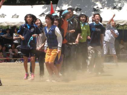 写真は、午前中最後の得点種目、みんなでジャンプ。中学生も参加し、31日(土)に行われる橘中運動会のいい予行練習になりました。真ん中の写真は、まだ小学校に入っていない子どもたちと60歳以上の大人たちとの玉入れ合戦です。勝者は? 3枚目の写真は、午前中の練習を終え、午後のボランティアに駆けつけるテニス部男子です。
