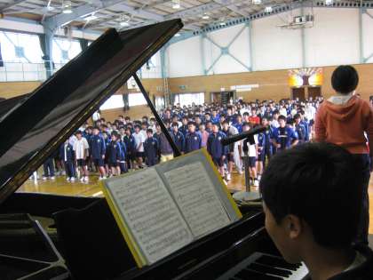 さわやかな風が気持ち良い5月19日の朝、5月の朝会が行われました。久しぶりに全校で合唱をし、気持ちもさわやかになりました。朝会でのお話は椿先生のお話でした。運動会にむけてそれぞれの学年とも一段階グレードアップできるように頑張りましょう!と全校生徒にむけてエールをおくってくれました。