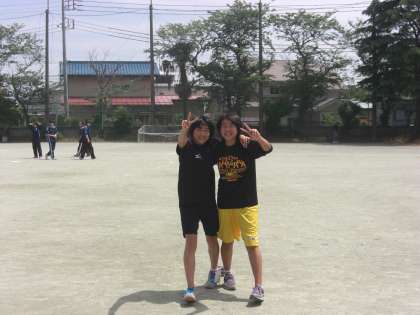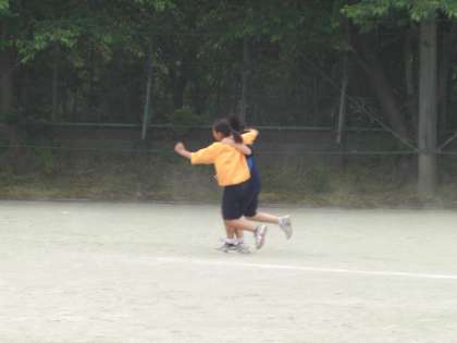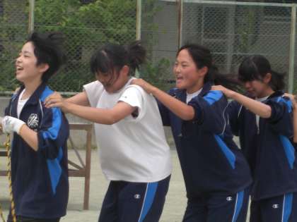 二人三脚の練習をしている生徒もいます。カメラを向けると自然にピース。ムカデの生徒はまだ余裕がありません。