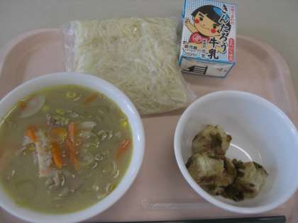 今日のメニューは、味噌ラーメン、しゅうまいの甘酢あんかけ、牛乳です。885kcal。しょうゆラーメン、塩ラーメン、そして味噌ラーメンがきました。どのラーメンもとてもおいしいです。次は何ラーメンかな?甘酢あんかけも一手間かけていただいてありがとうございます。毎日楽しみです。