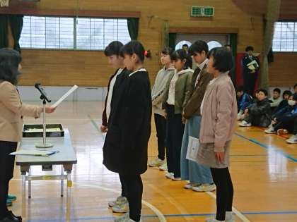バドミントン部の表彰は県西ブロック大会シングルス優勝、第3位とダブルス優勝、準優勝でした。1月20日の県大会での活躍を期待しています。男子ソフトテニス部はシングルスの県大会第3位の表彰でした。全校集会が落ち着いた雰囲気ででき、平成30年も橘中学校はとてもいいスタートがきれたと思います。