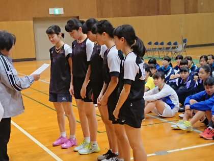 4月14日(土)西湘地区体育センターでバドミントン協会主催の大会が行われました。県西地区41チームが参加しましたが、決勝戦は橘中Avs橘中Bの同校対決になりました。写真は上から、橘中A、橘中B、部員全員の笑顔です。