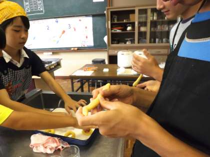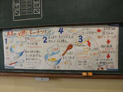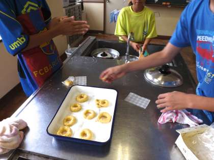 2年生の家庭科の授業で、ドーナツ作りをしました。題して灼熱のドーナツ。台風が近づいてきた影響か朝から蒸し暑い中、ホットケーキミックスを手でこねてリングにしてドーナツにします。形や大きさを工夫して、いろいろとかわいらしいドーナツが出来ました。