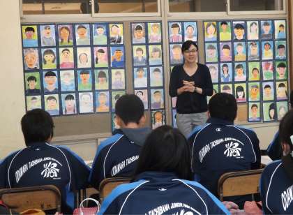 先日の3組に引き続き、1年1組と2組の鑑賞の授業を行いました。先日と同じく佐藤北久山先生においでいただき、講評を兼ねてお話をしていただきました。長い時間をかけて彫り、摺り上げた版画です。ただの上手・下手で終わってしまわないよう、それぞれの味わいを感じてもらえるように、指導をしていただきました。2月に松永記念館で、一般の方(子供)を対象に版画教室をひらくということで、学芸員の中村さんも来られていたので、鑑賞会に参加していただきました。