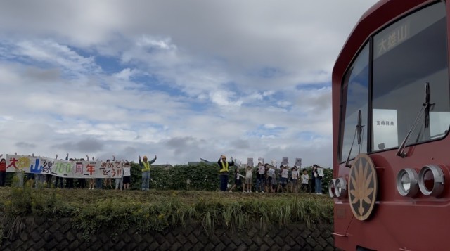 当日は朝まで雨模様でしたが、活動中は雨も止み、作成したものを掲げながら大雄山線にお祝いの気持ちを届けました。