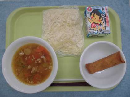〜今日の献立〜 牛乳 醤油ラーメン 春巻き 〜今日の地場産物〜 神奈川県:豚肉