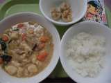 学校のキーマカレーには、豆がたくさん入っています。 豆には、日本人が足りてい...