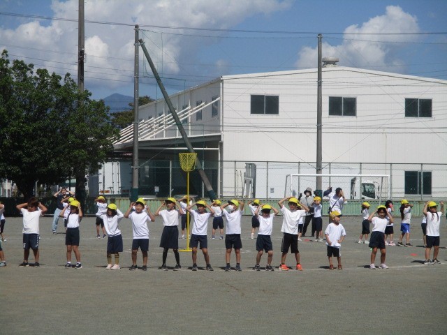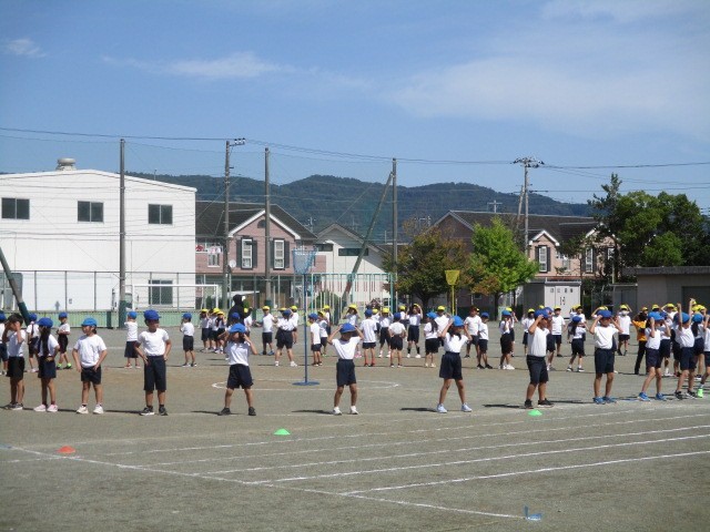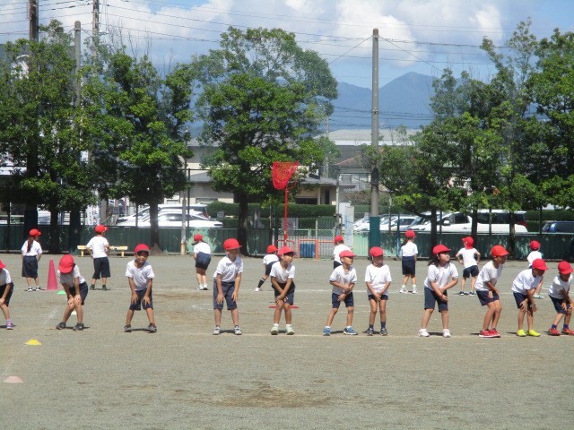 表現の練習の後は、1・2年生の団体種目「玉入れ」の練習になりました。3色の円の中央にはかごが用意してあります。玉入れをする前にかわいらしいダンスも披露する予定です。楽しみですね。