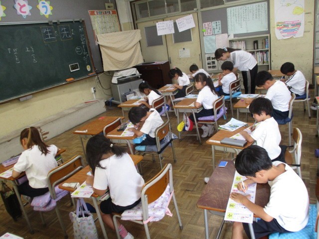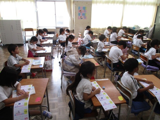 10月3日(金)、1年生は集中して机に向かっていました。見学すると漢字練習をしていました。4月はひらがなの練習でしたが、もう漢字にステップアップしています。空書きをしてから実際に鉛筆で書いていました。練習している漢字は、「先生」でした。画の長さにも気を付けていました。