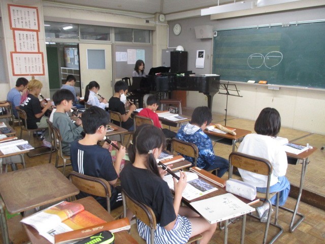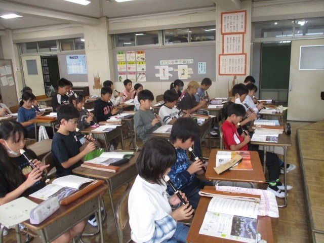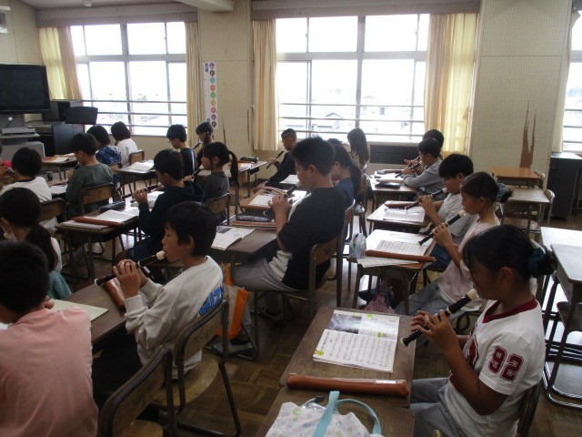 10月14日(火)、音楽室からリコーダーの音色が聞こえてきました。見学すると5年生が「星笛」という曲を音を出すところに気をつけながら全員で練習していました。リコーダーの音色が重なり合って響いていました。素敵な演奏になることが期待できます。