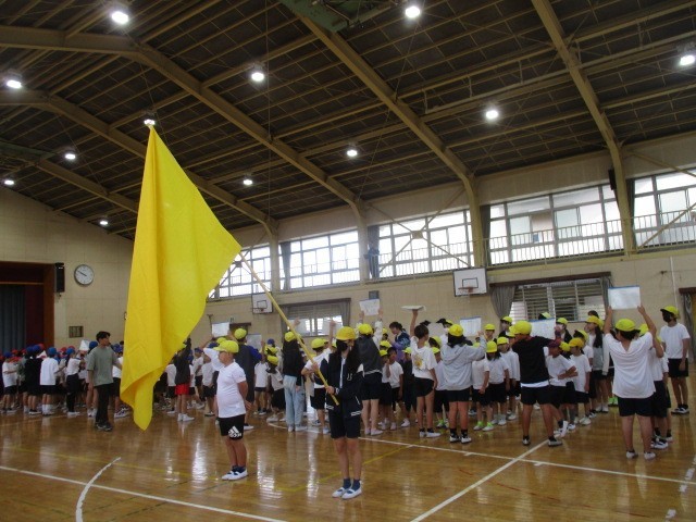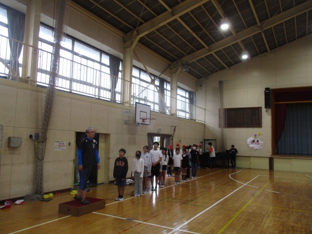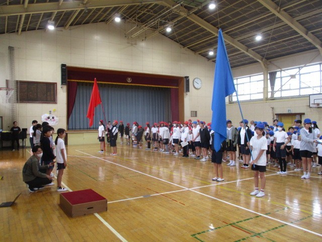 10月16日(木)、雨のため運動場に水たまりができ、開閉会式の練習を1・2・6年は体育館で行い、3・4・5・年生はリモートで全体の動きを確認しました。6年生が下学年をリードしており、当日も期待できます。