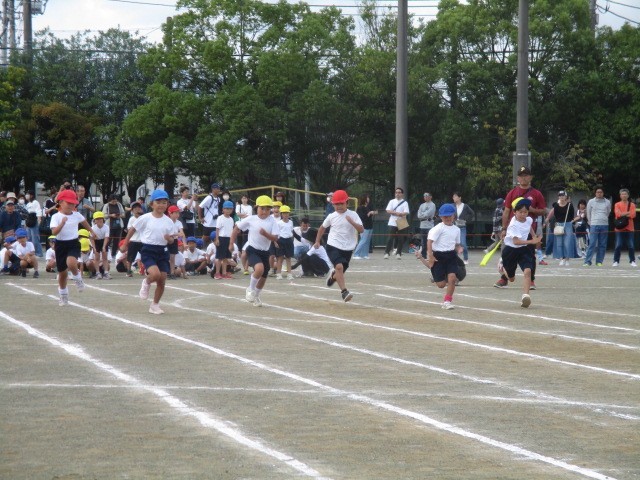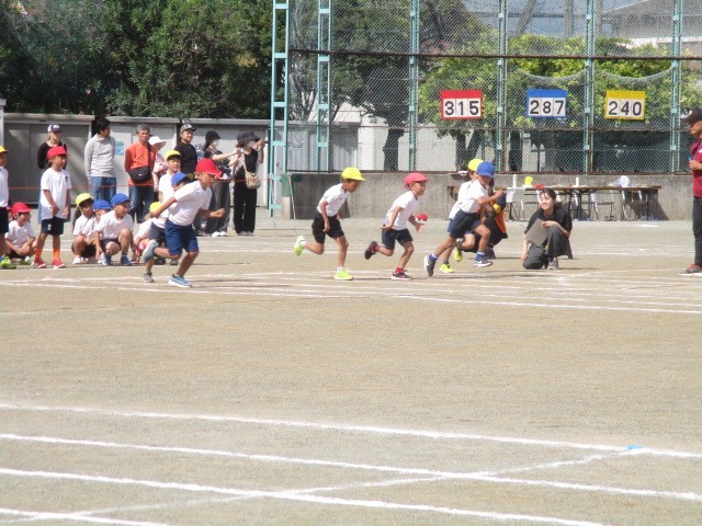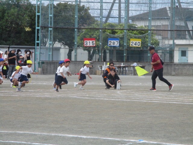 プログラム12番、1年生による「Go!winner!50m走!」です。はじめての運動会でしたが、50m先のテープめざして最後まで走り切ることができました。