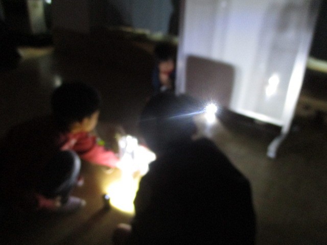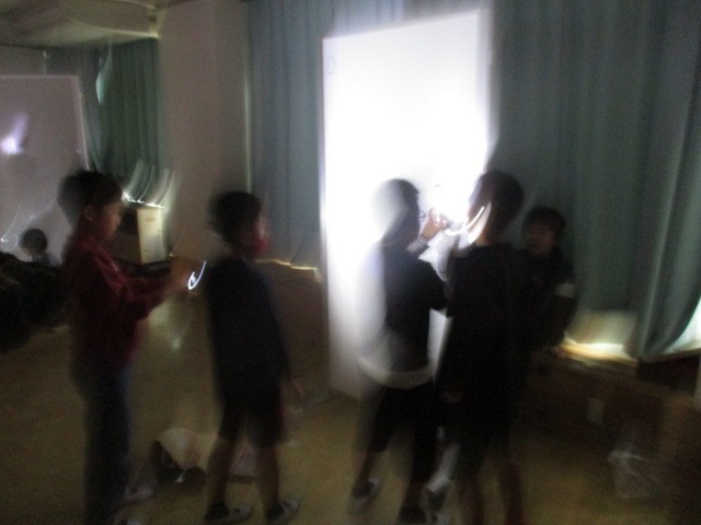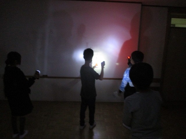 10月21日(火)、4年生は、くるみルームを暗くして、ペットボトルに懐中電灯の光を当てるなどしてできる影の模様を観察していました。光を当てるものや形の向きを変えたりすることによって影の形や模様も変わります。その変化を楽しんでいました。