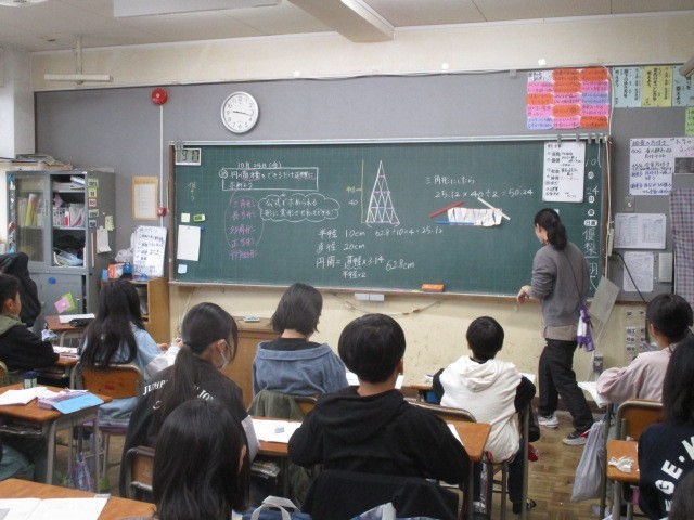 10月24日(金)、6年生は算数で、円の面積の求め方を考えていました。「公式で求められる形に変形する」ことをもとにして、実際に円を切って並べ三角形や長方形にしていました。そして、それぞれの辺の長さを考え、円の面積を求めていました。「形を変えて考える」見方がおもしろいですね。