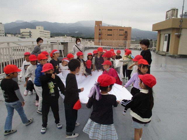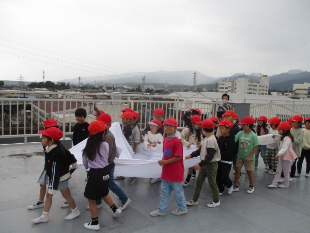 10月24日(金)、1年生は国語の物語文「くじらぐも」の学習でした。物語の様子をイメージしやすいように屋上へ行きました。そして、くじらぐもに乗った気持ちで、屋上を移動し始めました。楽しそうに物語の世界に入り込んでいました。