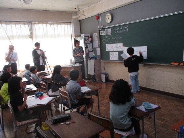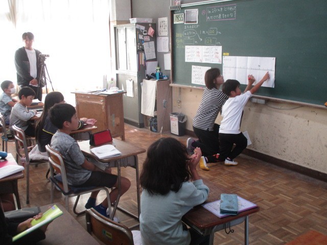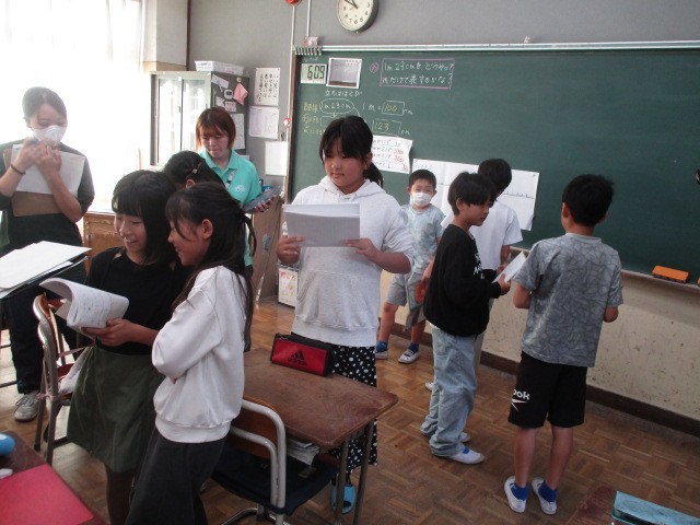 10月27日(月)、4年生は算数で1m23cmのmでの表し方を考えていました。途中に、相談タイムや友達に考え方を紹介する時間もありました。数直線を使いながら、1mを10等分した大きさは何m、0.1mを10等分したところの大きさは何mと長さの量感にも気を付けながら小数を使った表し方の正しい答えを導き出していました。