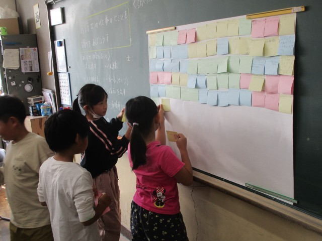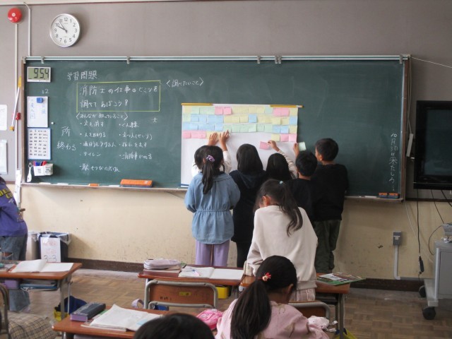 10月30日(木)、3年生は消防士の仕事について学習を進めていくようです。今日は、消防士の仕事について疑問に思ったことを付箋に記入し、黒板に貼っていました。たくさんの疑問です。わたしたちの暮らしの安全を守っていただいている消防士について知ることで、感謝の気持ちが高まりますね。