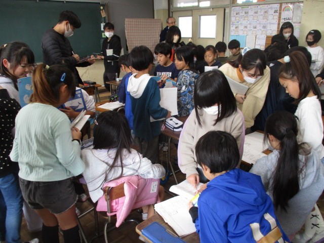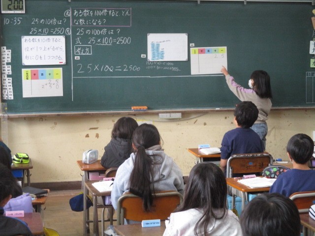 11月19日(水)、3年生は算数で「25の100倍は?」の答えの求め方を自分でまたは友達と相談しながら考えていました。100倍の求め方がわかると、次は「25の1000倍は?」に取り組みました。習ったことを生かして正しい答えを求めることができました。