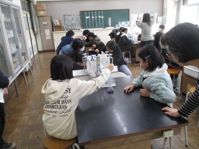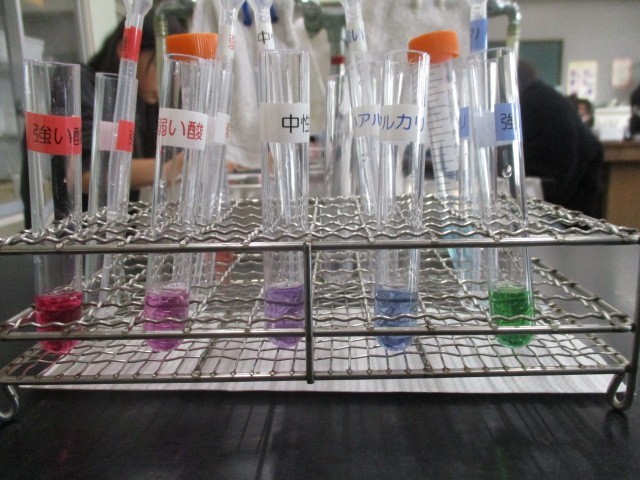 11月19日(水)、6年生は大学教授の先生方を招いて、理科の実験を行いました。「強い酸性」「弱い酸性」「中性」「弱いアルカリ性」「強いアルカリ性」の液体にむらさきキャベツ液を入れると???きれいに5色の色に変わりました。むらさきキャベツ液による色の変化で、アルカリ性か酸性かを判断できることがわかりました。理科実験の不思議さ、面白さ、興味が高まりました。