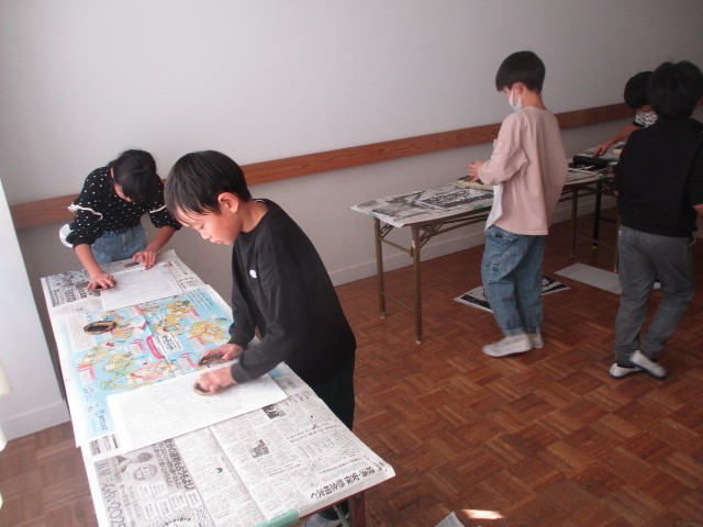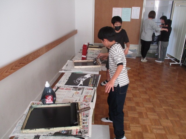 11月26日(水)、4年生は版画に挑戦していました。インクを繰り返し版に塗り、慎重に版画用紙を版に置き、丁寧にばれんを使ってこすっていました。出来映えを見ながら、また彫るかどうか迷っている子もいました。よい作品に仕上げるために考えている姿はすばらしいと思いました。