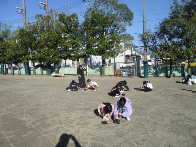 11月28日(金)、3年生は運動場で活動していました。見学すると黒い画用紙に虫メガネで太陽の光を集めていました。虫メガネと画用紙の間の長さを伸ばしたりし縮めたりしながら上手に集めると、煙が出てきました。みんな集中して取り組んでいました。