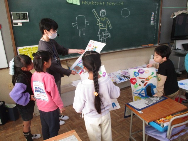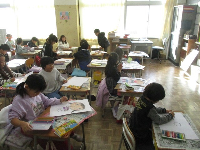 12月10日(水)、1年生は図工でクレヨンなどを使って画用紙に大きく人物を描いていました。そして、人物のそばには鉢がありそこから成長し、きれいな花を咲かせたあさがおがたくさん描かれていました。1年生が描いた絵の世界のあさがおも素敵でした。