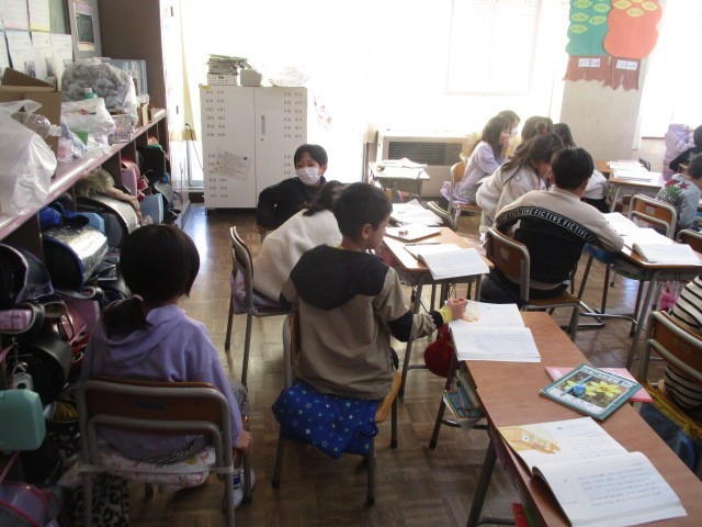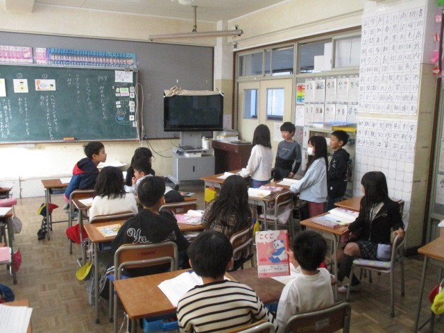 12月18日(木)、2年生は、国語の物語文「みきのたからもの」の学習でした。黒板に掲示された絵の出来事について発表していました。グループで話し合った後、勢いよく手が挙がり、グループで発表したり付け足しの発言があったりして意欲的な姿が見られ、うれしく思いました。