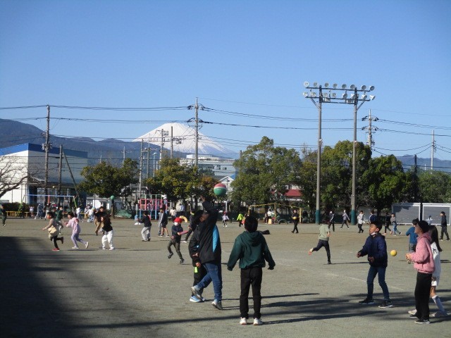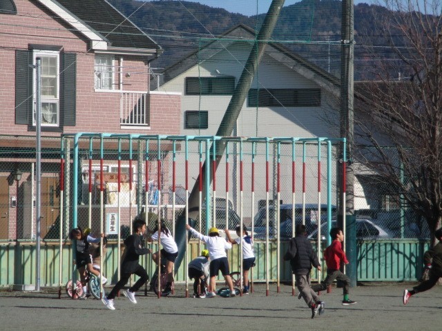 12月23日(火)中休み、今日は快晴です。豊川小学校の運動場から見える富士山も雪景色できれいでした。そして、運動場では、豊川っ子の楽しそうな声が響いていました。おにごっこ、ボール遊び、長縄、一輪車と様々な遊びが行われています。外で元気に遊んでいる子どもの姿を見ると、見ているほうも元気が出てきますね。