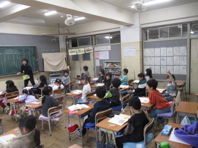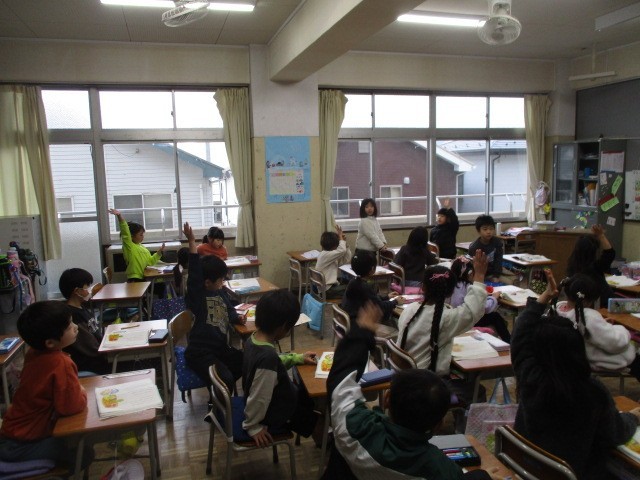 1月21日(水)、1年生は国語でたくさんの手が挙がり、「かき」「もも」・・・発表していました。おおくくりのもののなまえ