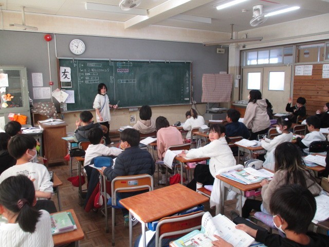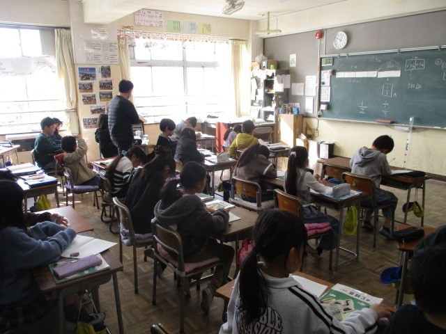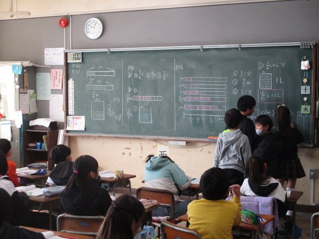 2月10日(火)、3年生は算数の時間でした。どのクラスも分数の学習で、問題を解いて、答え合わせをしていました。1mがいくつにわけられているか?そして、そのいくつぶんか?を確認しながら答えを確かめていました。