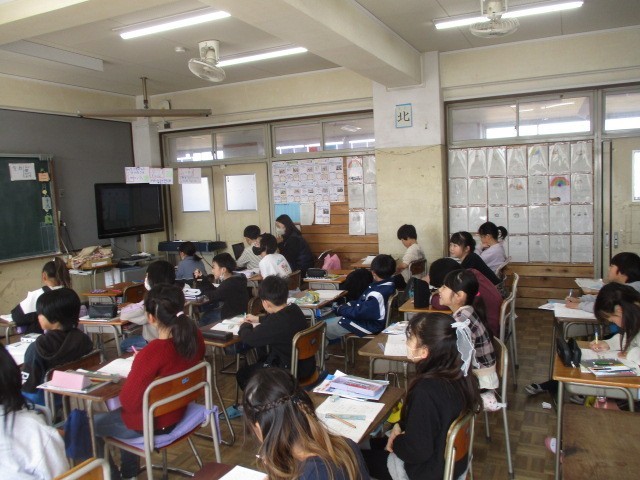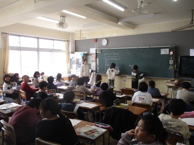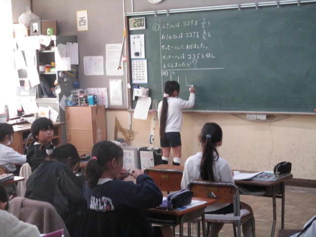2月18日(水)、3年生は算数で分数の学習をしていました。真分数ー真分数の計算では、答えを図を使って求めるなど、量の感覚もわかるようにしていました。また、友達が描いている図を静かに見ていました。すばらしいですね。