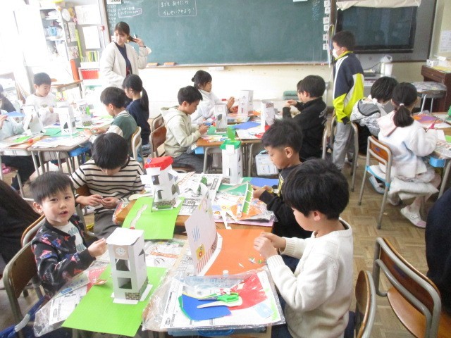 2月26日(木)、2年生は楽しそうに制作活動をしていました。、初めてカッターナイフを使い、切って作ったタワーの窓があいていました。そして、飾り付けも進んでいました。完成が楽しみですね。