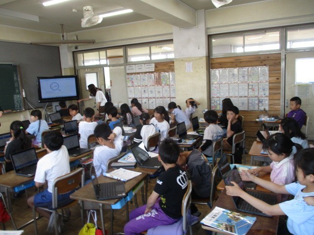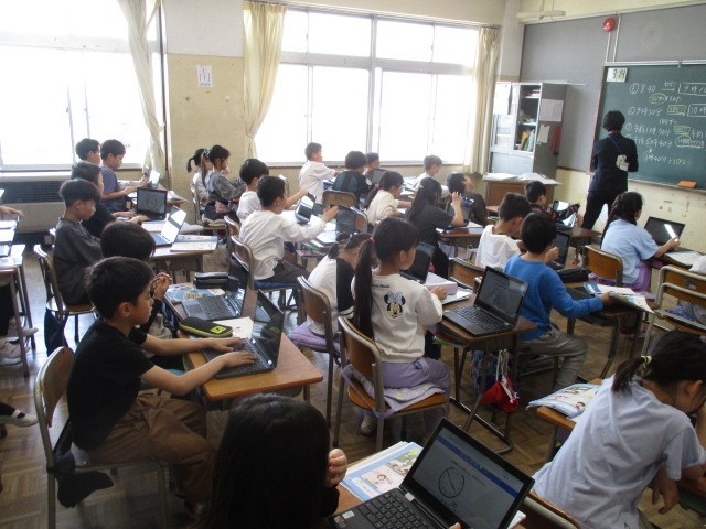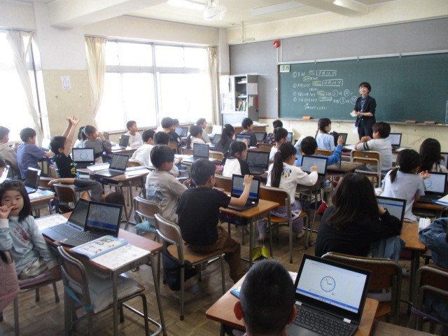 4月22日(水)、3年生は算数で時計の学習をしていました。学習用端末に時計を映し出し、何分後の時刻を考えていました。時計の文字盤や目盛りからまたは計算で何分後の時刻を求めることができます。生活に必要な知識・技能を正しく学んでほしいですね。