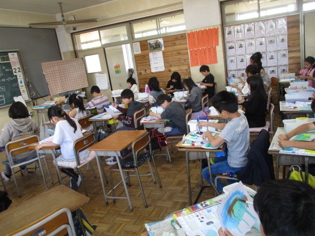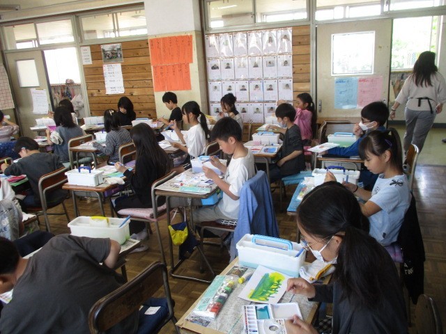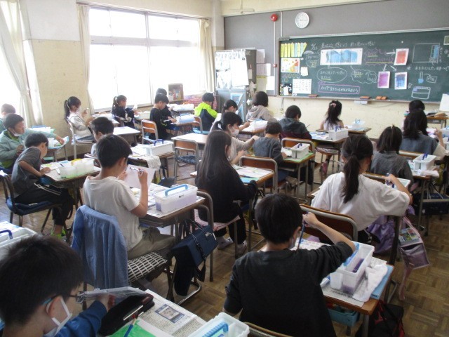 4月22日(水)、4年生は図工で絵具を使っていました。「絵の具で生きている感じを表そう」がめあてでした。画用紙の上のほうに色を塗り、つぎに違う色を塗り、画用紙を持ち上げて絵の具を上から流していました。絵の具が生きているように画用紙の上を流れています。色の世界が広がりますね。