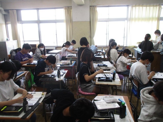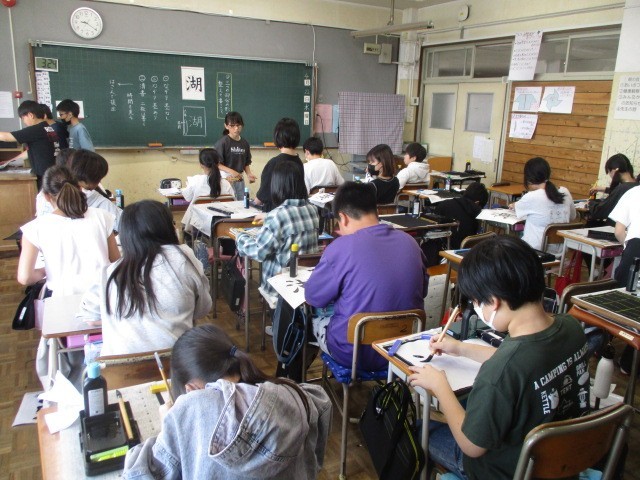 4月22日(水)、6年生の教室から墨のにおいがしてきました。見学すると習字で「湖」を書いていました。さんずいの点の位置や形に気を付けながら丁寧に書いていました。落ち着いて取り組めており、さすが6年生です。