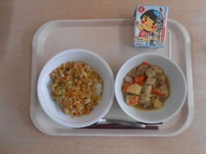 牛乳、とりそぼろごはん、じゃがいもとしらたきの炒り煮 (647キロカロリー)、