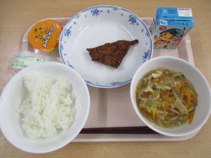 牛乳、ごはん、さばの竜田揚げ、白菜と春雨のスープ (702キロカロリー)