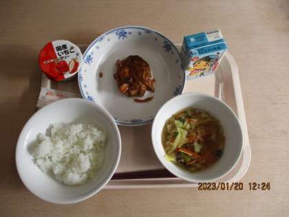 牛乳、いちごゼリー、ごはん、豆腐のハンバーグきのこソース、野菜スープ