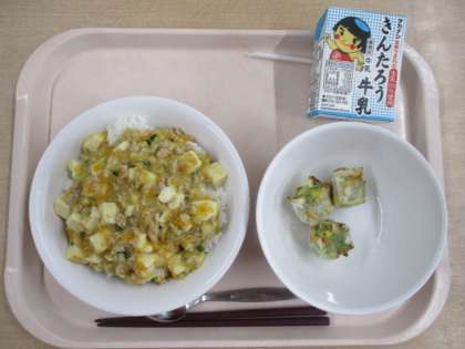 牛乳、マーボー丼、野菜入りシュウマイ (668キロカロリー)