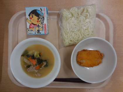 牛乳、肉みそうどん、はんぺんのもみじ揚げ (663キロカロリー)
