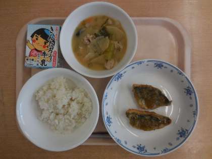 牛乳、麦入りごはん、あじの梅ソースがけ、とん汁