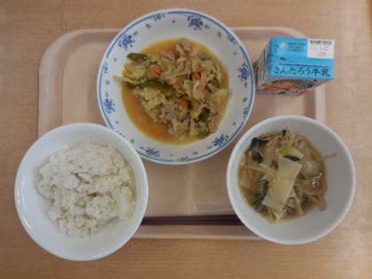 牛乳、麦入りごはん、ホイコーロー、ワンタンスープ (635キロカロリー)