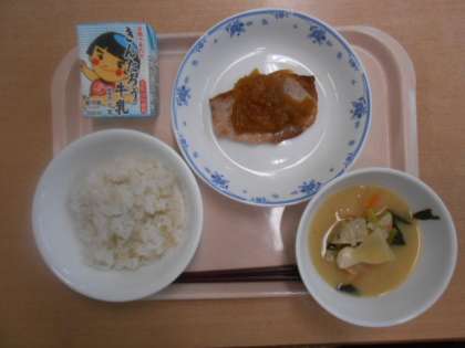 牛乳、麦入りごはん、ぶた肉のオニオンソースがけ、つみれ汁 (614キロカロリー)